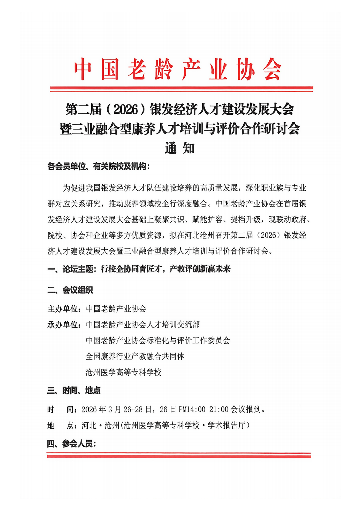 第二届(2026)银发经济人才建设发展大会暨三业融合型康养人才培训与评价合作研讨会通知