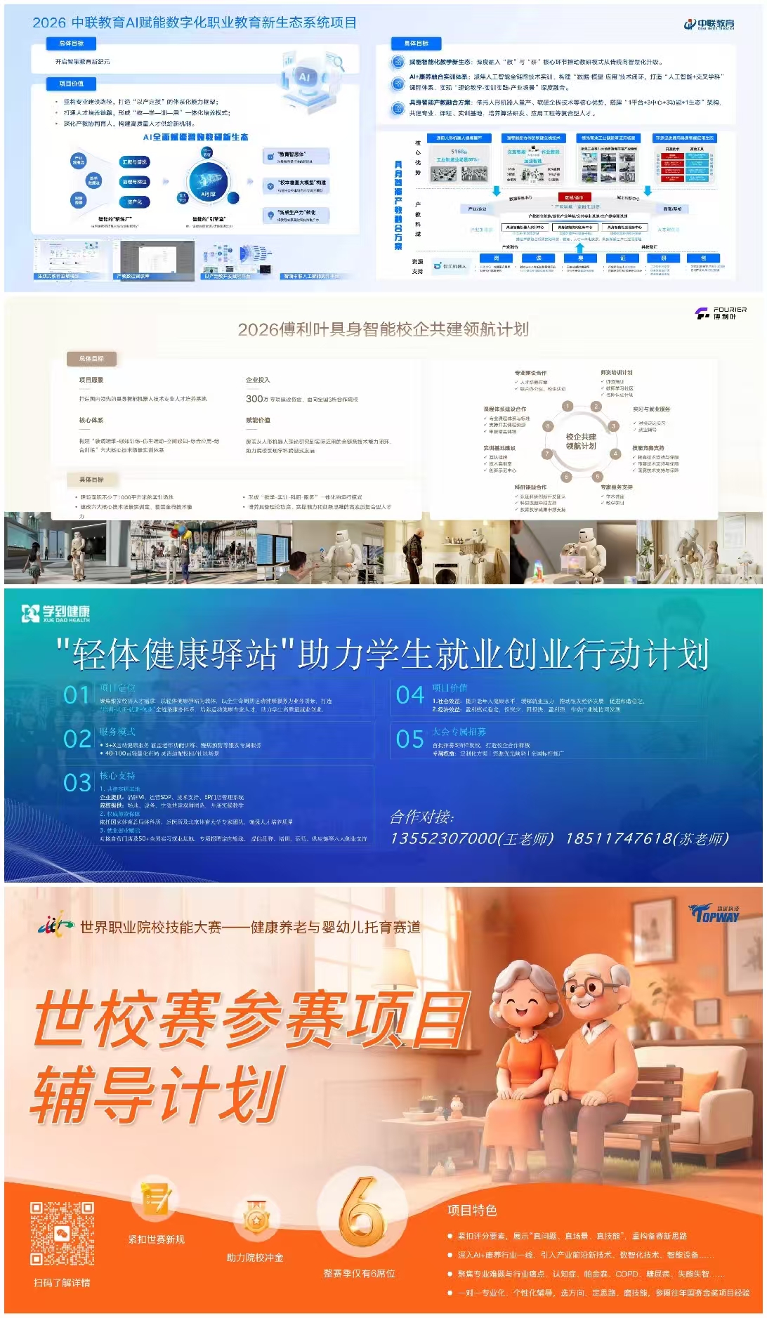 企业参与并赞助专业共建及人才培养是本次大会亮点!四大校企合作项目是中联集团教育科技的《AI赋能数字化职业教育》、上海傅利叶的《具身智能校企共建领航计划》、北京学到健康集团的《健康驿站就业创业》、上海踏瑞科技的《世校赛参赛辅导计划》,四大前沿项目均面向全国遴选3所院校开展项目深度共建,为康养人才培训提供产业资源支撑,推动人才培训评价工作与产业需求精准对接。